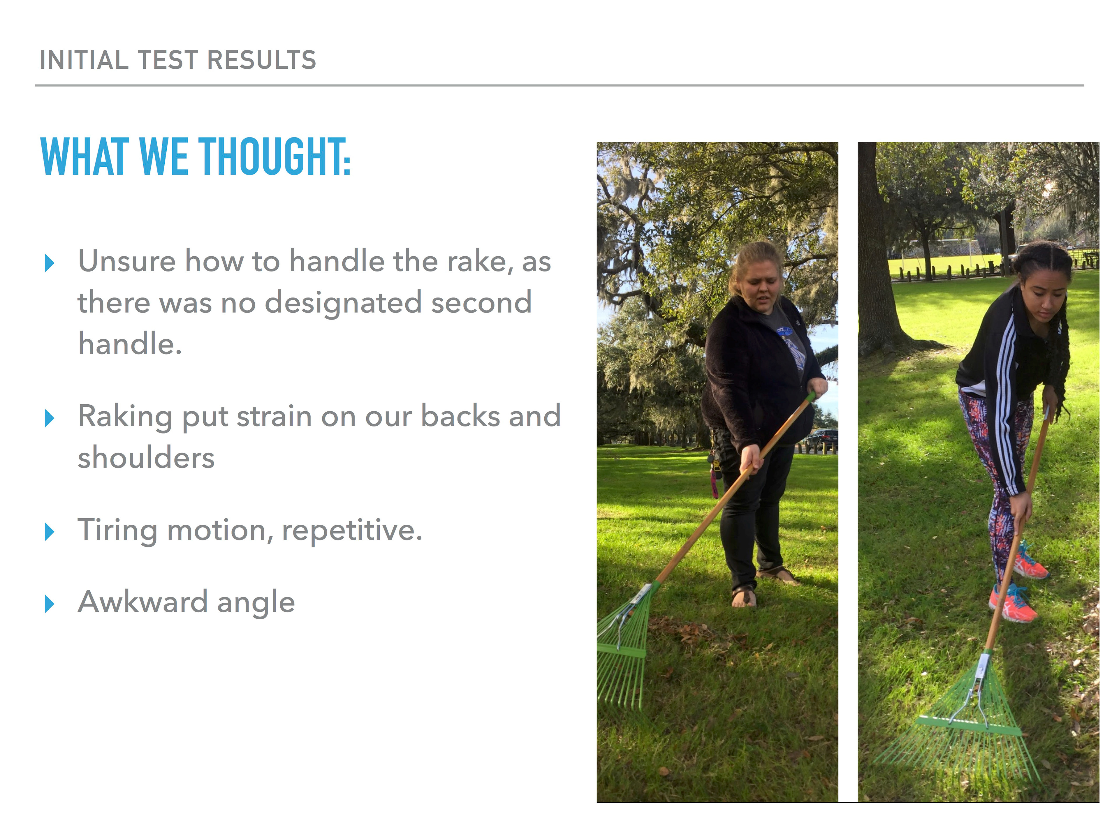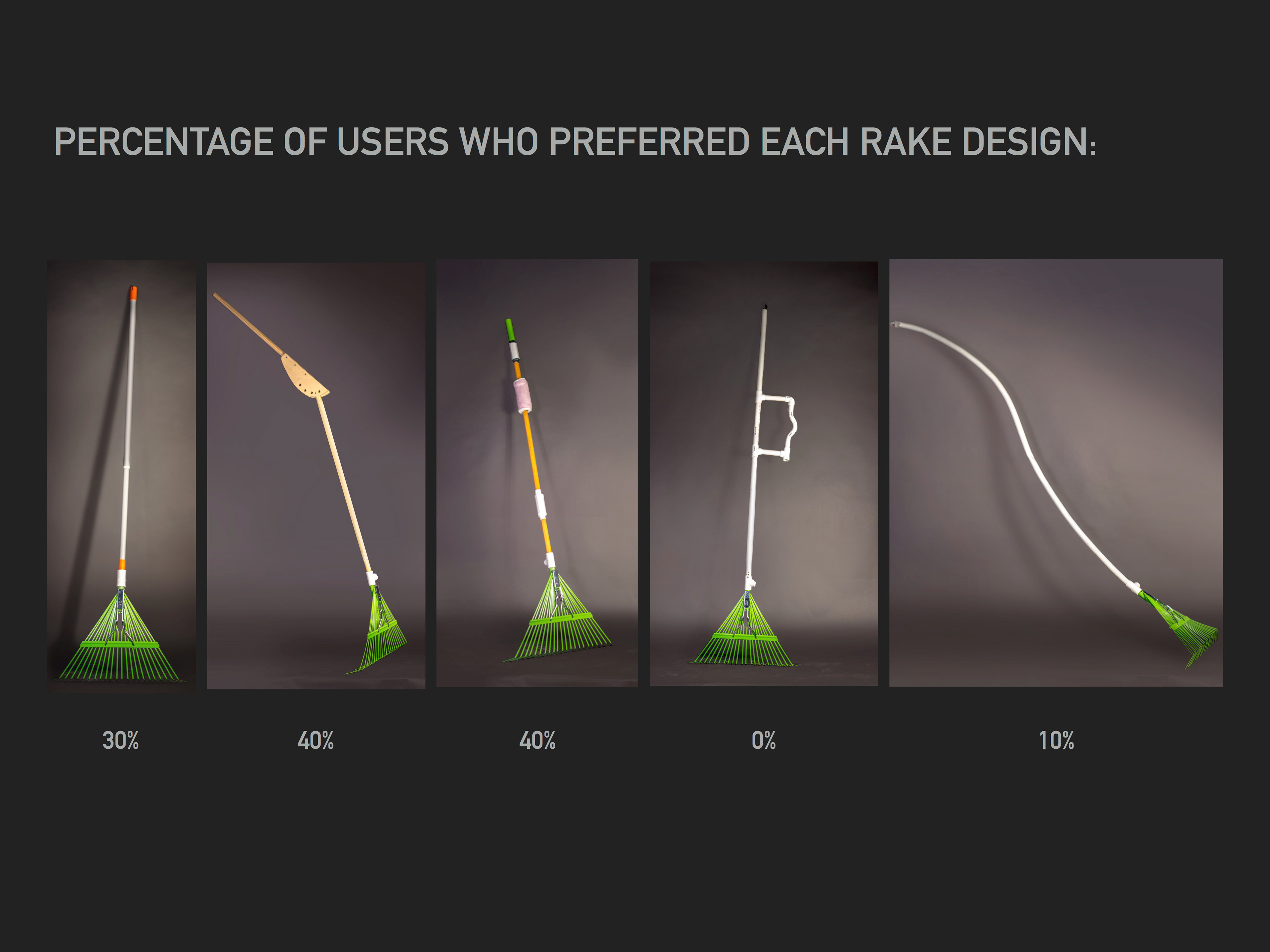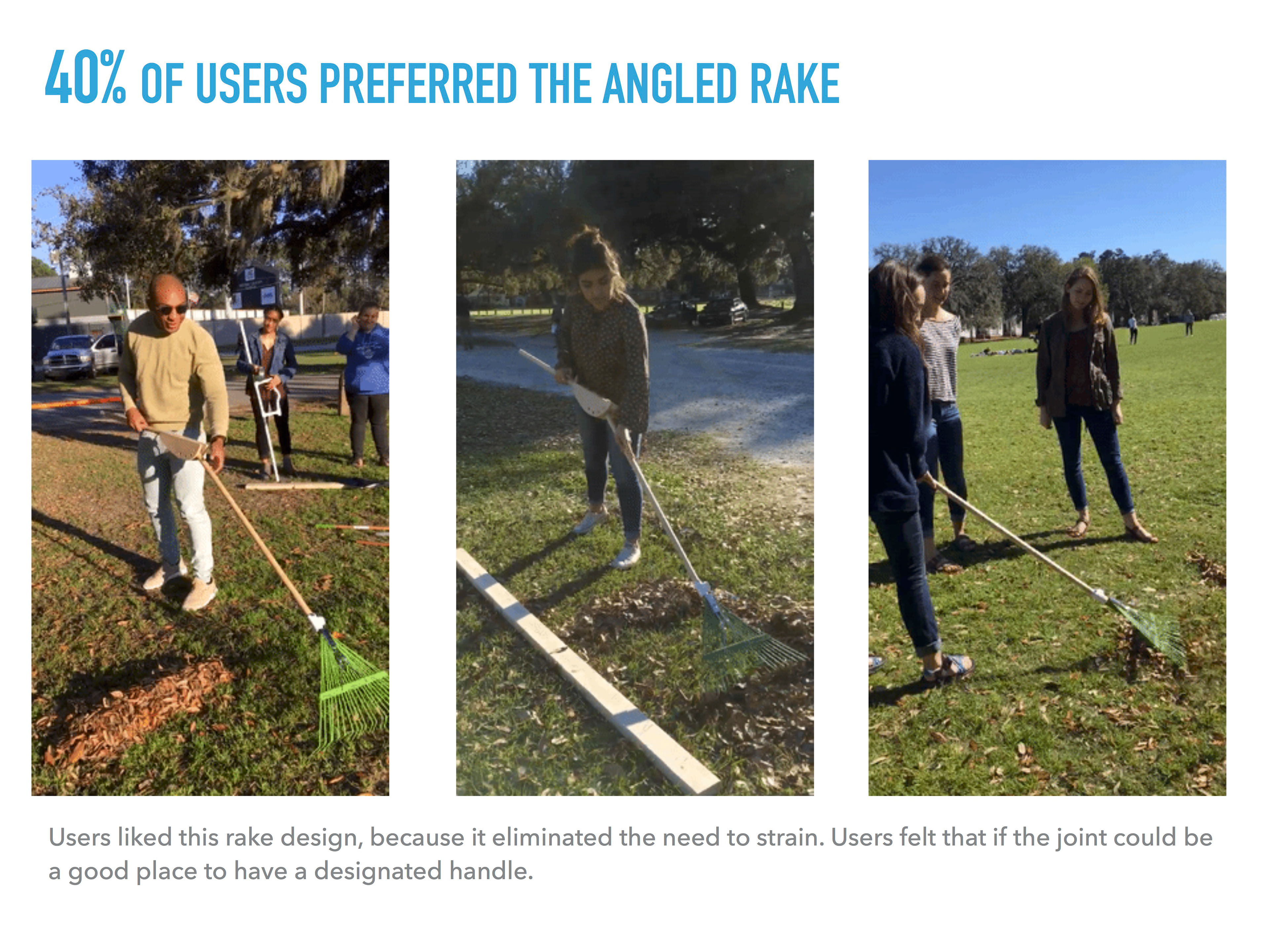 Through conducting contextual research and a series of user testing phases, our team created a more ergonomic rake design. This design is visually appealing and eliminates the action of bending while raking; resulting in a more enjoyable raking experience for the diverse population. 🍂